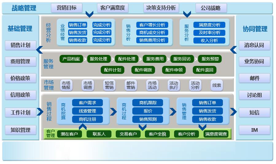 CRM的功能可以歸納為三個(gè)方面:對銷售、營銷和客戶服務(wù)三部分業(yè)務(wù)流程的信息化;與客戶進(jìn)行溝通所需要的手段(如電話、傳真、網(wǎng)絡(luò)、Email等)的集成和自動(dòng)化處理;對上面兩部分功能所積累下的信息進(jìn)行的加工處理,產(chǎn)生客戶智能,為企業(yè)的戰(zhàn)略戰(zhàn)術(shù)的決策作支持。一般來講,當(dāng)前的CRM產(chǎn)品所具有的功能都是上圖的子集。