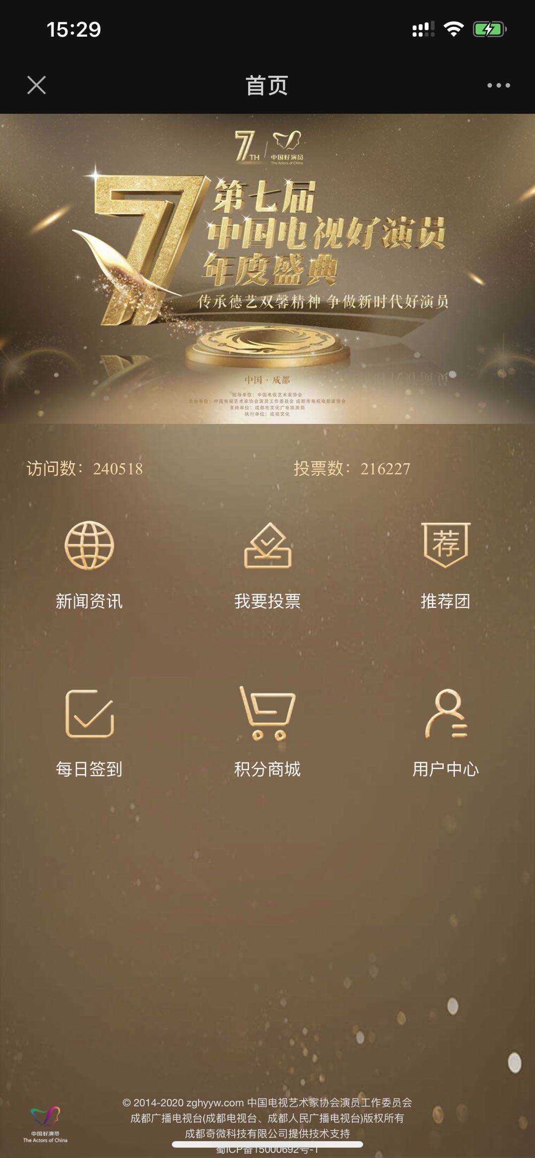 由中國(guó)電視藝術(shù)家協(xié)會(huì)指導(dǎo),中國(guó)視協(xié)演員工作委員會(huì)主辦,成都奇微科技公司提供全程技術(shù)支持的“中國(guó)好演員”推選活動(dòng),旨在提升中國(guó)電視演員的品質(zhì),對(duì)演員從演技、職業(yè)道德和綜合素質(zhì)等方面進(jìn)行全方面考量。2020年9月15日24:00,第七屆“中國(guó)電視好演員”網(wǎng)絡(luò)投票在微信、微博客戶端正式開啟。受疫情影響,今年的儀式以線上發(fā)布的方式啟動(dòng)。中國(guó)視協(xié)演員工作委員會(huì)會(huì)長(zhǎng)陳寶國(guó)、秘書長(zhǎng)張光北分別錄制視頻,誠(chéng)摯感謝各位專家、評(píng)委、演員、觀眾們對(duì)“中國(guó)電視好演員”推選活動(dòng)的大力支持,并熱情邀請(qǐng)廣大觀眾們能繼續(xù)參與并支持“中國(guó)電視好演員”推選活動(dòng)。
